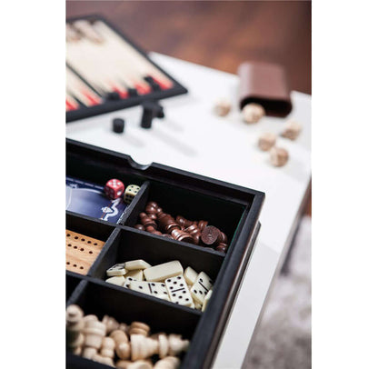 - Collection de jeux dans une boîte en bois avec différents jeux de société et de plateau
