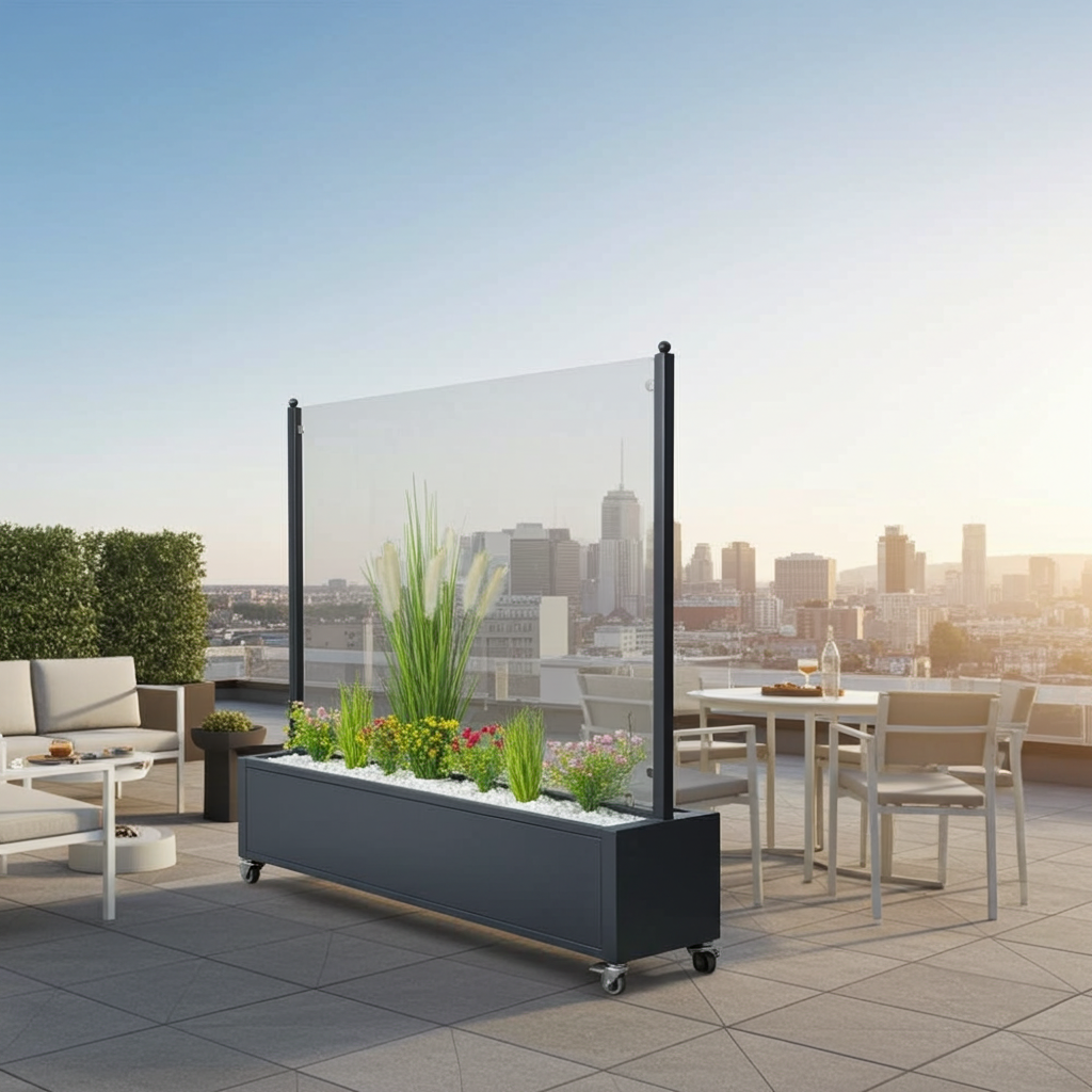 Questo paravento mobile con un'altezza totale di circa 180 cm su terrazza o balcone vi permette di reagire in qualsiasi momento alle condizioni del vento in cambiamento. Con un paravento mobile in vetro potete schermarvi da sguardi indesiderati sulla vostra terrazza o balcone e proteggervi efficacemente dal vento. Un paravento mobile entusiasma non solo dal punto di vista funzionale, ma anche estetico. Scegliete tra le nostre diverse varianti di alta qualità e progettate la vostra terrazza o il vostro balcone secondo il vostro gusto personale.